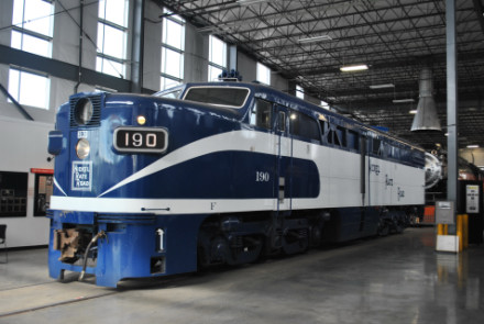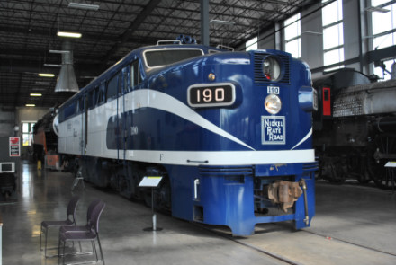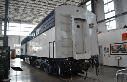 The first engine you see is Nickel Plate PA-1 190 built by American Locomotive Company in 1948 as Santa Fe 62L. In 1967, it was sold to the Delaware & Hudson Railway and re-numbered 18. They sent it to Morrison-Knudsen for rebuilding in 1975 and it was classified as Morrison-Knudsen PA-4. In 1978, this locomotive was sold to the Ferrocarriles Nacionales de Mexico, along with the other three surviving PAs. It and the former D&H 16 were both out of service by 1981 and spent 19 years stored in Empalme, Sonora, Mexico. The Smithsonian Institution and rail preservationist Doyle McCormack obtained the damaged and gutted unit and brought it back the United States in 2000, along with the former ATSF 59L/D&H 16, which was donated in 2011 to the Museum of the American Railroad in Frisco, Texas. The other two units, DH-17 and DH-19, are preserved at a museum in Puebla, Mexico. Mr. McCormack began restoring the locomotive in 2002 and has chosen to restore the locomotive as a Nickel Plate Road PA-1, the first unit he ever rode in. In 2012, the near-fully restored NKP 190 was moved to the new Oregon Rail Heritage Center.