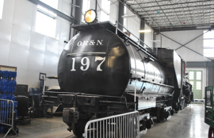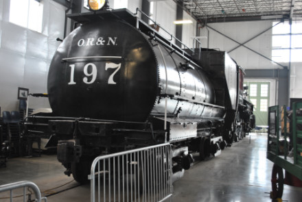 Oregon Railroad & Navigation Company 4-6-2 197. built by Baldwin in 1905 for the Oregon Railroad & Navigation Company. It arrived just in time to handle the passenger loads to the Lewis and Clark Centennial Exposition in Portland. In 1923, the OR&N had been absorbed by the Union Pacific and the steam engine was re-numbered 3203. Union Pacific retired it in the 1950s and in 1958, they donated it to the City of Portland and it went on display near Oaks Amusement Park, soon joined by Southern Pacific 4449 and Spokane, Portland and Seattle 700. In 1987, it was moved to the Brooklyn Roundhouse.