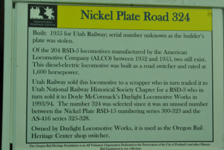 Nickel Plate Road RSD-5 324 built by American Locomotive Company in 1955 as Utah Railway 306. It was sold to Industrial Salvage & Metals in Salt Lake City in 1983 and traded to the Promontory Chapter, NRHS, for scrap value in seven donated former Kennecott locomotives in January 1984. It was stored here until sold to Doyle McCormack in October 1993, painted as a fictitious Nickel Plate 324 by February 1994 and leased to Willamette & Pacific. At the end of August 2022, it was bound for Ogden, Utah and restoration for display at the Utah Railroad Museum.