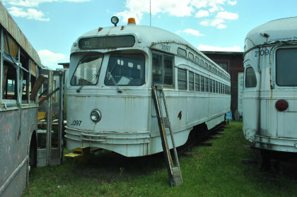 Allegheny Port Authority No. 4002 Interurban CarOriginally built by St. Louis Car Company as Pittsburgh No. 1702, a PCC. In the late 1980s the car received extensive rebuilding. Although it retained the original Westinghouse controls and body bolsters the car received a new operators control panel, air conditioning, and essentially a new body. Currently the car rests on shop trucks, a pair of wide gauge Clark B2's minus their electrical components. We have one spare pair of CTA B3 trucks to assign to the car but need the funds to rebuild those trucks, acquire a trolley base with pole, windows, air conditioning (necessitated by no operable windows), and some minor items to return the car to fully operational status.