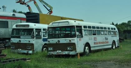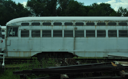 Denver Tramway Corporation Electric Trolley Bus No. 519Built by the J.G. Brill Company in 1940 as a 44-seat rubber-tired trolley coach with Westinghouse controls. The coach operated from 1940 until 1955. James Kunkle restored the coach. The roof and some seat cushions require repair due to animal damage while the car was in storage in Denver.