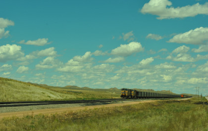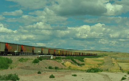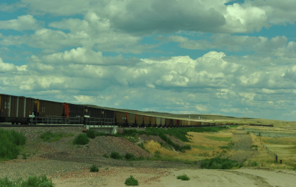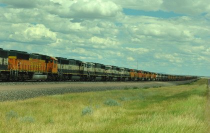 A long line of stored BNSF power, one of two at the Donkey Creek yard. We drove east, saw a headlight and turned on the first road we could.