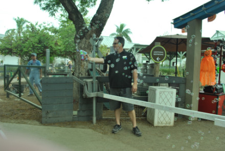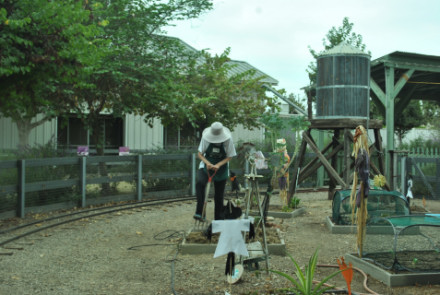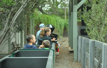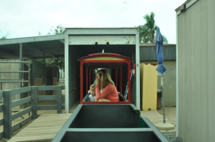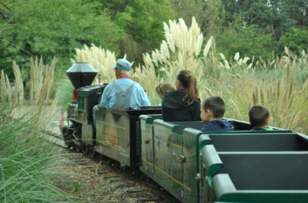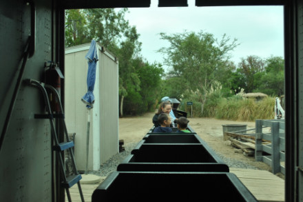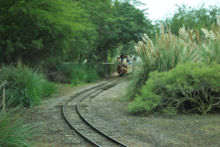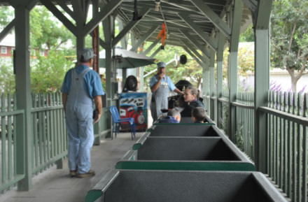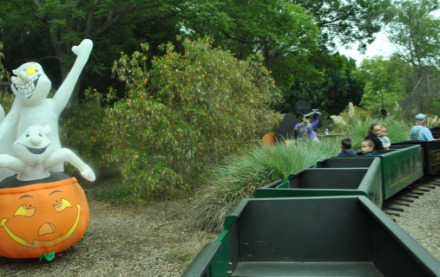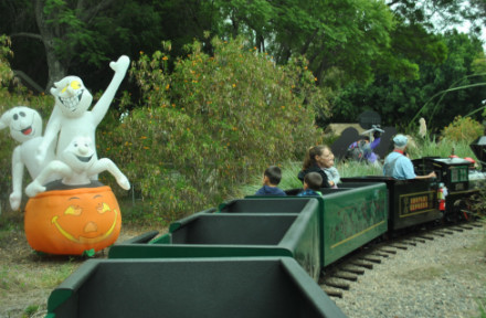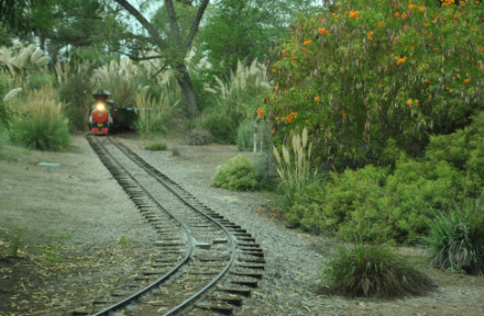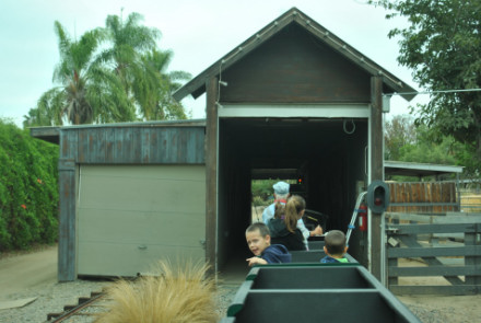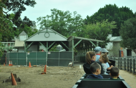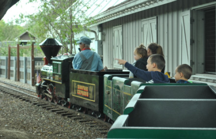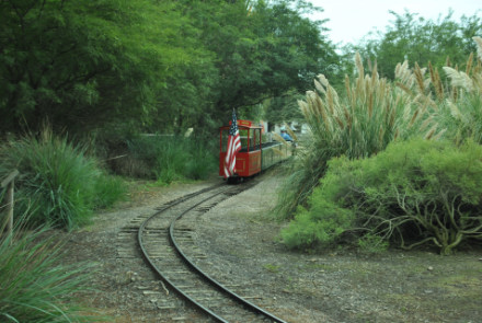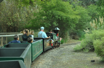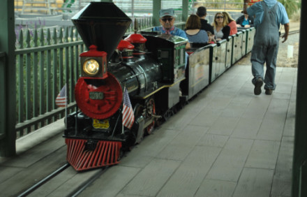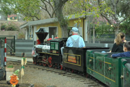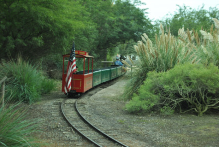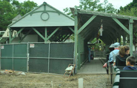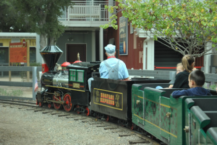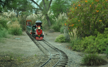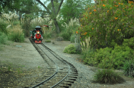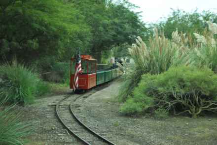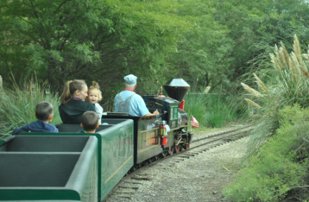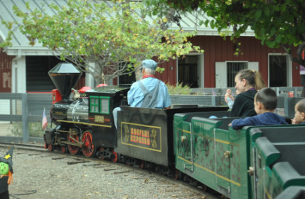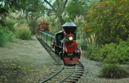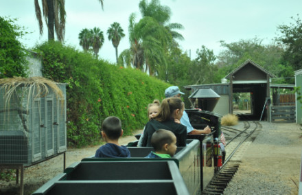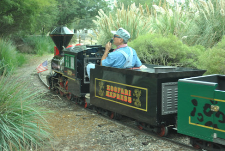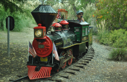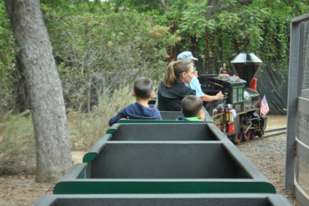 the larger species. Ocelot Basin is home to a breeding pair of Brazilian Ocelots located in two separate habitats. Interactive elements include a research canopy blind, sand table and a children's den. One of the most popular attractions at the Santa Ana Zoo is the Zoofari Express children's train. There are two engines: 1030 and 1036. Both are 14 gauge, 4-4-4 configuration locomotives. The original 1030 engine was constructed in 1954 by the Hurlbut Amusement Company of Buena Park. Engine 1030 was originally installed at Santa's Village in Sky Forest, California. It operated there continuously for 44 years. When Santa's Village closed in 1998, the Friends of Santa Ana Zoo purchased the entire train and 660 feet of original track. The train was then restored by volunteers from Mater Dei High School with the help of Bud Hurlbut. The restored train opened at the Santa Ana Zoo in the spring of 1999. The track length was expanded to 1,850 feet. Engine 1030 was gas-powered, but in 2006 was converted to electric power. Engine 1036 is a new electric-powered locomotive that was installed in 2005, along with new passenger cars. The zoo also features a Conservation Carousel with a 33 animal line-up including the giraffe, giant panda, African elephant, cheetah, hummingbird, lowland gorilla, bald eagle, jaguar, zebra, Bengal tiger, sea otter, panther, seal, sea dragon and a custom-made anteater. The carousel also features a wheelchair-accessible Swan Chariot. I saw the train returning to the station area. The train pulled into the station and then the other passengers detrained and exited. I boarded my car for my first ride on the train here in my own hometown. The board at the station. With a toot of the horn we started our journey around the zoo. The train took the first curve on the railroad. A look back to the station area. The human bubble machine. The Crean Family Farm red barn. The train is running along the west side of the Santa Ana Zoo. The stable building at the Crean Family Farm. The rear of the Crean Family Farm red barn. The McCormick Farmall tractor. Goats at the Crean Family Farm. The train took another curve on this unique railroad. Another tractor and plow. Heading to the tunnel. also known as the storage shed for this train set. The second train here is in the other part of the shed. Into the tunnel we went. We went through the tunnel on this railroad. Next we will run along the Tierra de las Pampas or "Land of the Grasses." Animals of the Tierra de las Pampas or "Land of the Grasses." This is part of Boo at the Zoo. The train took a left hand curve. The train took a right hand curve. All too soon, we were returning into the station. I thanked the crew then walked to a good photo location to catch the next trip of the train at this spot. The animals keep me entertained while I waited for the train to arrive. The train passed my photo location. On my way out I shot from the Bank of the Amazon. I walked to my car and left the Santa Ana Zoo a very happy train rider.