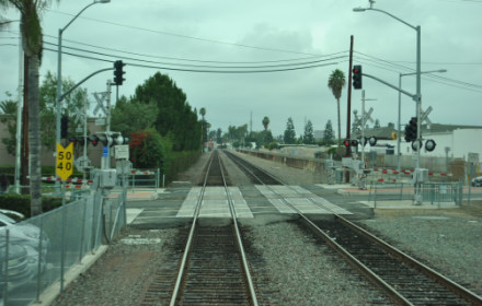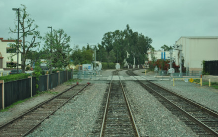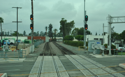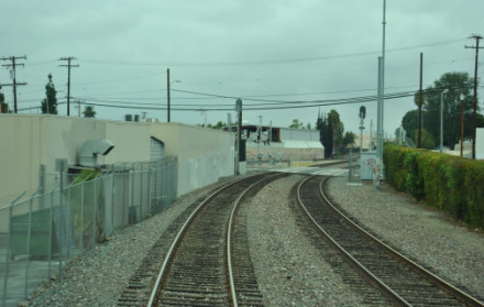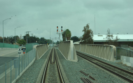The train left LAUPT with the Coast Starlight waiting for its 10:15 AM departure for Seattle. I returned inside the car and talked with the other passengers as well as enjoying Norm's stories of his days with the Santa Fe Railroad. The train made a fast trip to Fullerton where we picked up two more passengers then sprinted to Anaheim where there were plenty of Los Angeles Ram fans waiting for Pacific Surfliner 567 to take them to their game today. The train ran to Orange and I went onto the rear platform to give you a trip through Santa Ana, including the station stop there. We start with the crossong of Santiago Creek then through CP Lincoln.