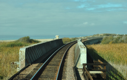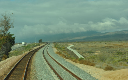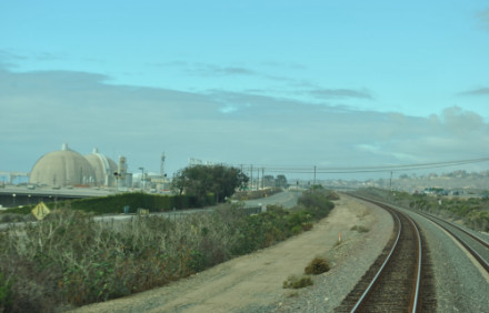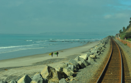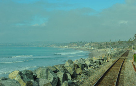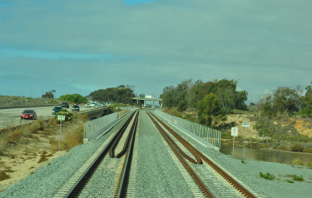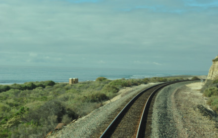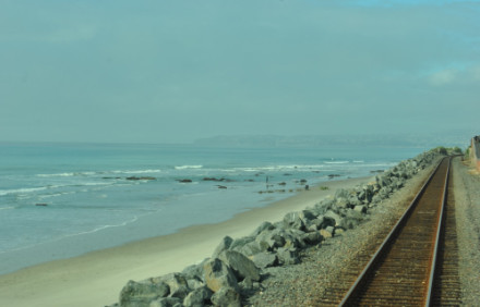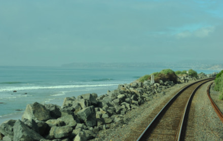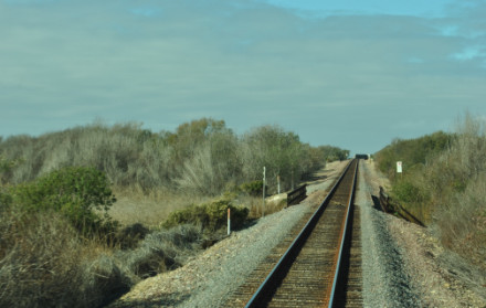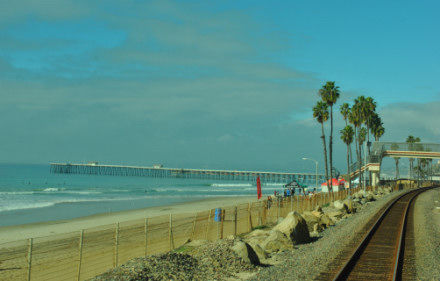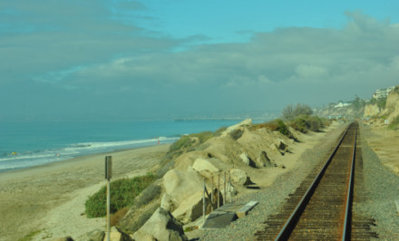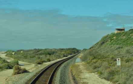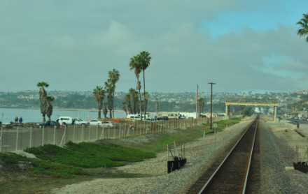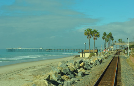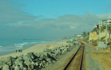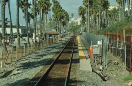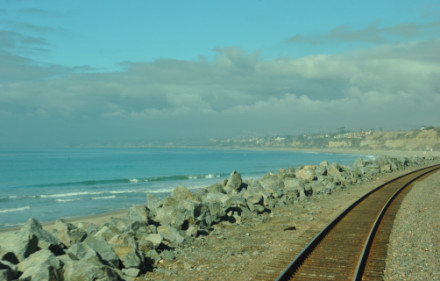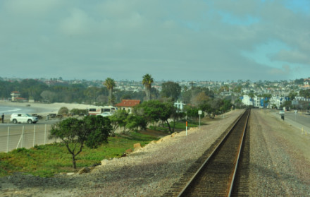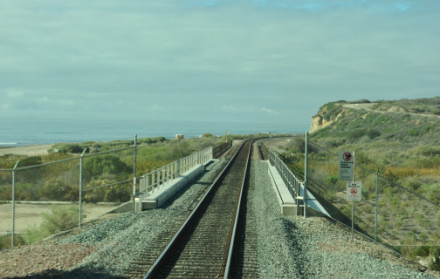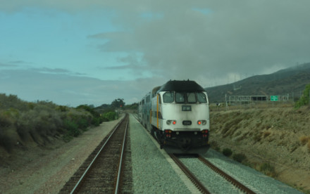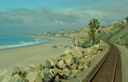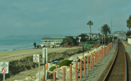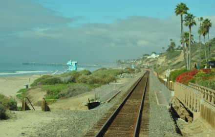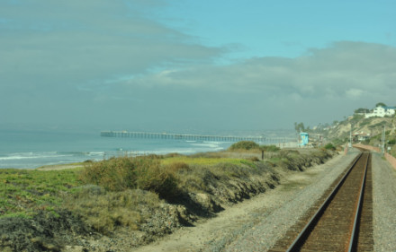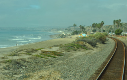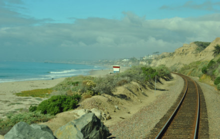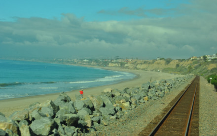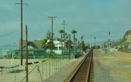 The train has reached the City of Tustin and I returned inside for more great conversation. We stopped at Irvine then climbed to the highest point on the Surfline before dropping down the grade to San Juan Capistrano, our next station stop before running the rest of the way to the beach where I went outside on the rear platform. Now let's enjoy the ride along the beach south to County Line.