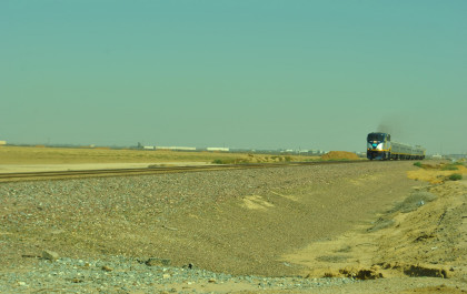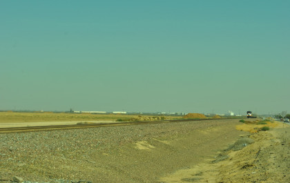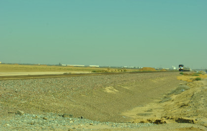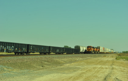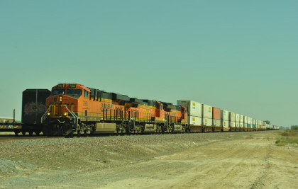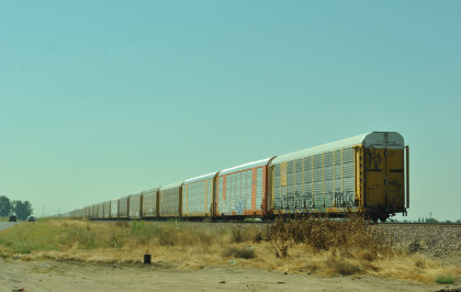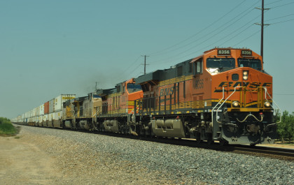 8/13/2016 My mother and I ate breakfast at the hotel, checked out and drove back to Escalon where I filled the car with petrol. Just east of town, a westbound BNSF freight passed one in the siding.