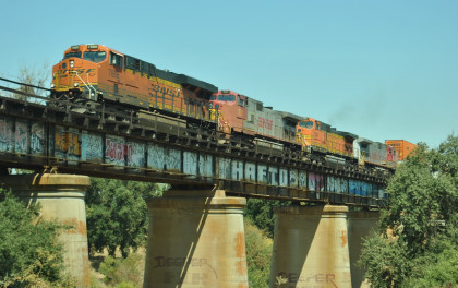 BNSF 7888 East at the Merced River bridge. Since BNSF 7888 East stopped the traffic at all the crossings, we were able to get to Merced quickly, stopped by the Amtrak then went back the same way we had come north and stopped at Carl's Junior in Madera for lunch. We travelled on California Highway 99 south to California Highway 41 to California Highway 201 to Fowler Avenue, taking that to Douglas Avenue, 12th Avenue to Hanford-Aroma Road to 11th Avenue to Kansas Avenue and the grade crossing there.