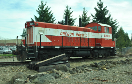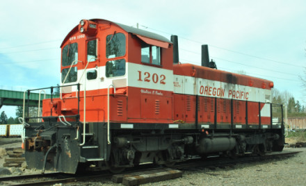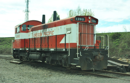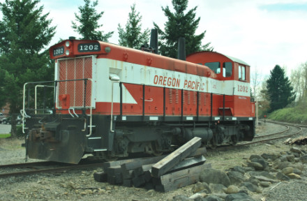 Oregon Pacific GMD SW9 1202, nee Canadian Pacific 7403, built by Electro-Motive Division in 1955. From here we headed to the Southern Pacific Canby station.