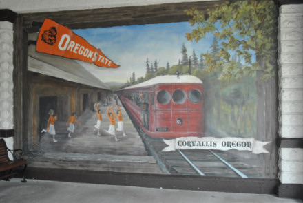 A mural on the building. We took Bob and Elizabeth back to the Rodeway Inn then picked up Bob Gordon before we drove to Winterail 2016 at Corvallis High School.