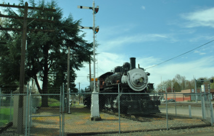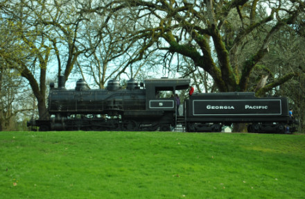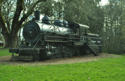 Georgia Pacific 2-6-2 5 built by Baldwin in 1922 as Brooks-Scanlon Lumber Company 5. It worked in Bend, Oregon and was later sold to the Alaska Junk Company in Portland then bought in 1956 by the Georgia-Pacific Corporation to work in Toledo. That year, Georgia-Pacific had purchased a stretch of former Coos Bay Lumber trackage from Yaquina and Toledo to Selitz and Monmouth, but 5's life on the line was short-lived. It was abandoned in December 1959 and the following year, the locomotive was donated to the City of Corvallis and went on display in Avery Park.