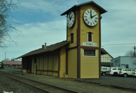 The Southern Pacific station in Woodburn is now at St. Lukes School and is used as their Teen Center. We returned to Bob and Chris and after getting the time for the tow and contacting Les Schwab Tire Center, Bob sent Elizabeth off with Chris and I and we headed to our next stop at Mt. Angel.