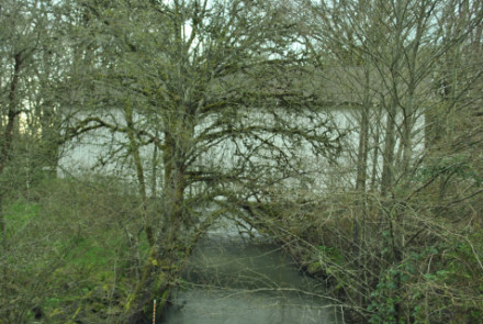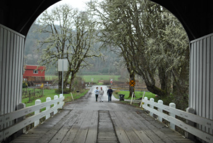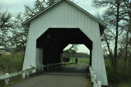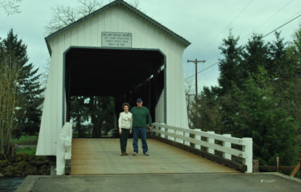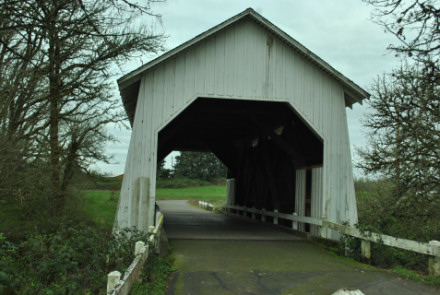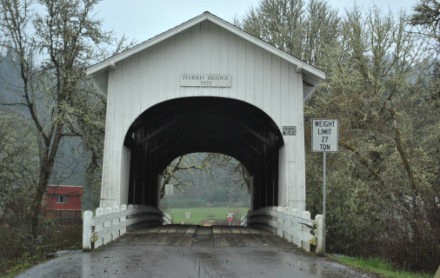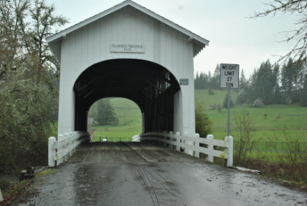 The Harris Covered Bridge built in 1936. We drove back to Corvallis and parked at the Fairgrounds then took a long walk to our third covered bridge of the morning.
