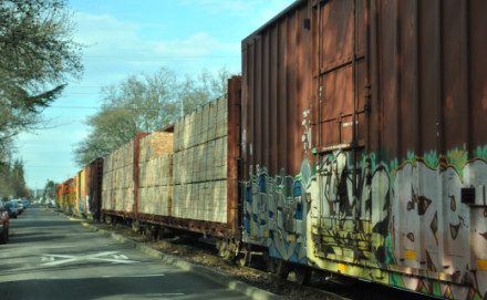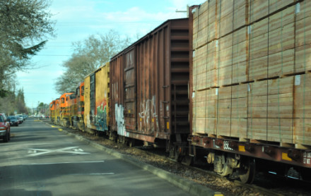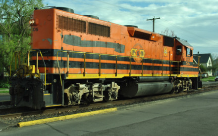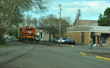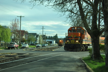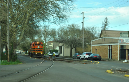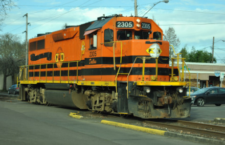 The Corvallis switcher, Portland & Western GP39-2 2305 built by Electro-Motive Division in 1974 as Santa Fe 3603, came down NW 6th Street then threw the switch so that the Toledo Hauler could come through Corvallis.
