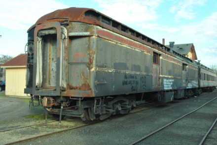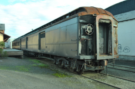 Spokane, Portland and Seattle baggage car 91 built by Barney and Smith in 1915. It was transferred to Burlington Northern in 1970 and became maintenance-of-way car 976124 in 1975. Later it became part of the Pacific Railroad Preservation Association roster and resold to a private owner in Corvallis.