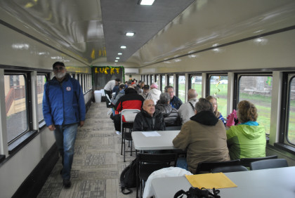 Our photo runby of the train arriving at the depot with the engineer using the Mars headlight. An experienced photographer would time as I did so when the Mars light was shining at you, you waited to take the picture until it went away. That way you only got the train in the picture, not the blinding light. At this point, Elizabeth and I walked over to the crossing where the crew was about to start loading the train. I put Elizabeth across from me at which time I yelled that famous line I love to say -- All Aboard! People immediately started to form a line to board the train. As it was raining, I told everyone to get on the train and Elizabeth would check their tickets later when we got underway. This way I would not have a train of wet passengers, although some people chose to do that later on. At the top of the vestibule, Bob Alkire passed out the trip guides I had made especially for this trip to all passengers and those crew who wanted one. The train got underway at 9:00 and I was off on new mileage but not drinking any Coca-Cola at this point. I made my way out to the open car for a few minutes for some fresh air and to start taking photographs. But first, I decided to walk the train to make sure everyone was comfortable in their seats or at tables.