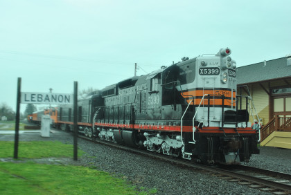 As we were nearing Lebanon, Bob came through the train announcing a photo opportunity for the passengers that he discussed with the excellent A&E train crew. The plan would be spot the train at the street crossing and open both vestibules on both sides of the train there. People who did not want to take any more photographs were free to detrain and leave. The rest of us with cameras would detrain on the west side of the train and line up for the spotting of our Black Widow SD9 with the BN Lebanon station sign as a prop. Once everyone was off the train, and I had told the conductor what to do, we spotted the train in perfect position for still photography. All the passengers who wanted to would then have another opportunity to take more pictures of the train. I detrained first and walked down to shoot a few more pictures of the train before everyone else.