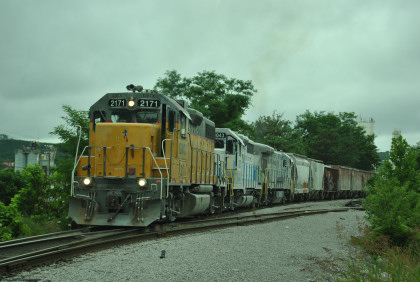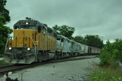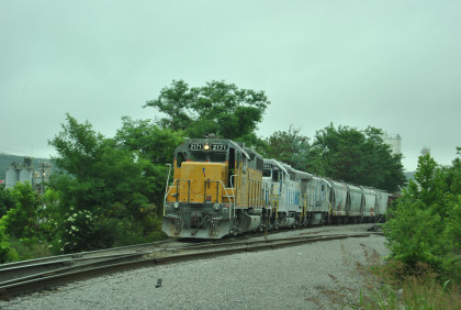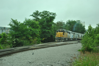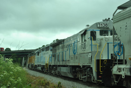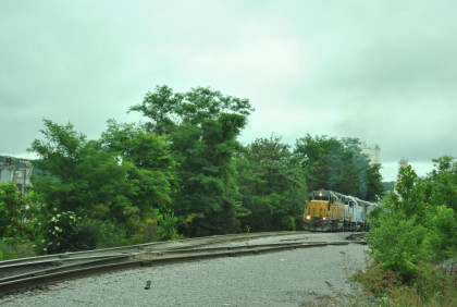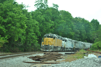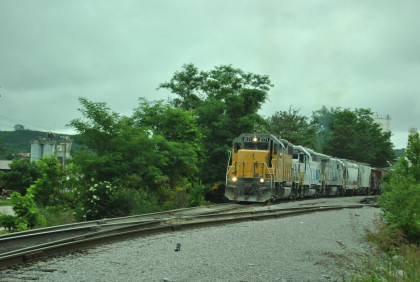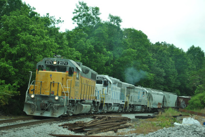 The third time he pulled way past us but then reversed into the yard. Having taken enough pictures of this move, we just waited for him to depart. He had seventeen loads to be delivered to the Norfolkl Southern at Emory Gap as he had trackage rights from Rockwood. Once he left we then started to chase in the two cars, with me following Steve to our first location at the Ashburn Drive grade crossing, where we waited for about fifteen minutes before he arrived.