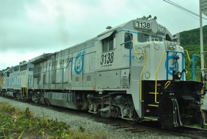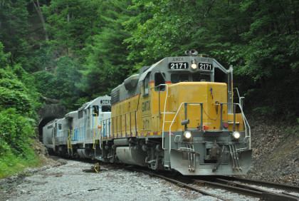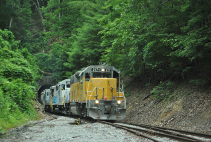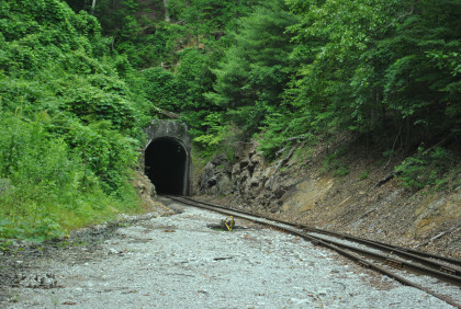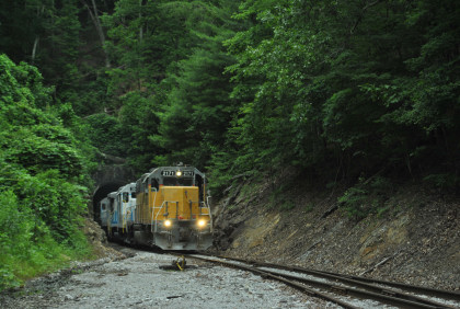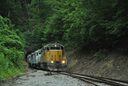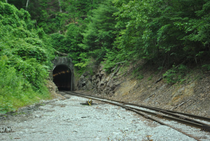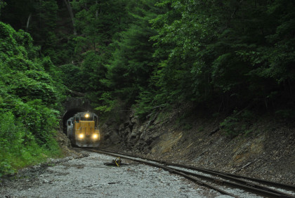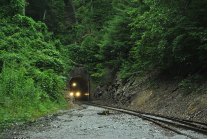 The Lhoist train on the Piney Creek bridge. From here I led the way to the Willett Hollow Tunnel that is under Mount Roosevelt Gap and we waited for the train because there was a downed tree and the train crew had to use chainsaws to cut up the tree before proceeding. Once they finished, the train could be heard coming our way.