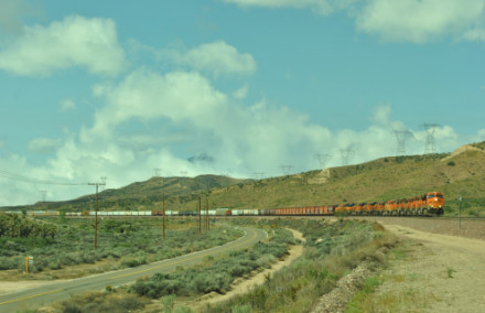 BNSF 7270 East took Track 3 to Summit this morning. We proceeded to California Highway 138 and noticed all the construction and earth moving that had already taken place. Summit was in pea soup clouds so we made our way east to the Summit Valley where it was clear, but with a cool wind blowing and set up at a new location for my photography. We did not have a long wait.