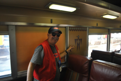 Me pointing to the Kachina on the wall of the car behind my seat.