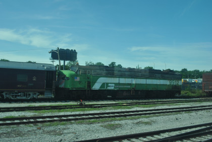 Chicago, Burlington and Quincy E9A 9912 built by Electro-Motive Division in 1955 as Chicago, Burlington & Quincy 9987B. In 1970 CB&Q merged with three other companies forming Burlington Northern. The locomotive became Burlington Northern 9982 in 1970 and was sold to the West Suburban Mass Transit District in 1972 and leased back to the BN. During October 1973, it was rebuilt by Morrison Knudsen and returned as E9AM 9912, named "Village of Brookfield" and pulled commuter trains for the BN under contract with the RTA until retired in July 1992. It was purchased by the Nashville & Eastern for a proposed commuter operation, but was replaced by an EMD F40 before operations commenced.