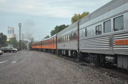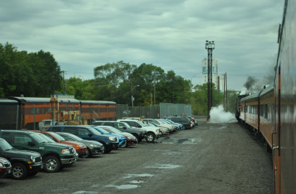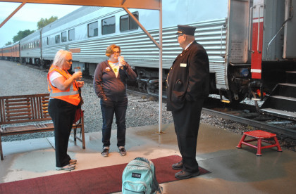 Conductor Ron Rahn chatting with two Milwaukee Road 261 volunteers. Just after 8:00 AM, boarding commenced and I saw Greg Molloy, a good friend and the former president of the National Railway Historical Society. As I felt the train start to move at 8:55 AM, I went to the vestibule.