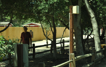 I rode to Solana Beach this morning to get my missing miles returned home to put up the mileage then Robin was at my door and a few minutes later we drove to Irvine Regional Park. This was Robin's first visit to this unique park. We paid three dollars to get in on this weekday morning and parked at the railroad station parking lot. I went to the ticket window and came away with two free tokens to ride. We then set up for a picture of the train returning.