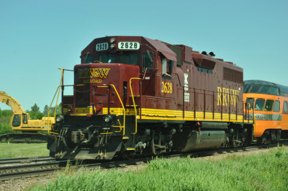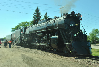 Milwaukee Road 261 Beckenridge to Kindred 6/3/2017Milwaukee Road 261 was damaged by a Canadian Pacific Railway ramp diamond last night which was the reason for the diesel pulling the Red River Valley employee train this afternoon. Last night they cooled off the engine then a new patch was welded on fixing the leak, the steam pressure was brought back to normal, the patch worked and the engine was deemed good to pull the train back from Kindred to Breckenridge. A great job by everyone on the Milwaukee Road 261 steam crew.