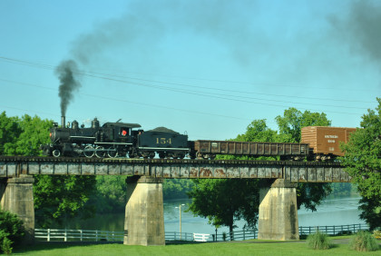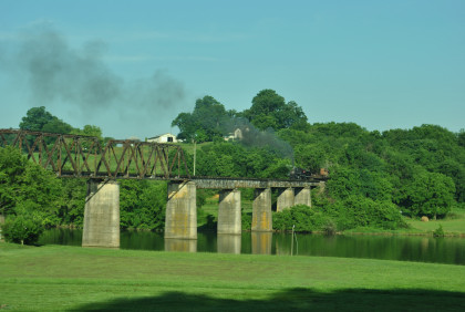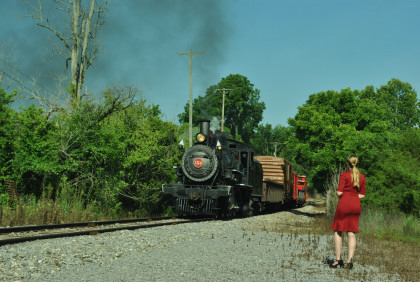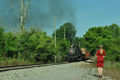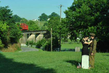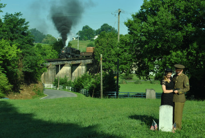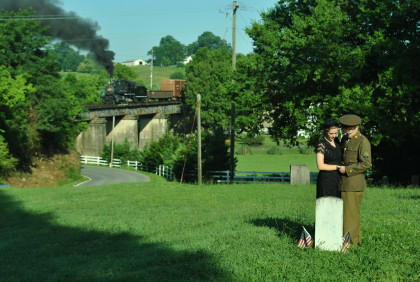 The actors portrayed the sadness of coming to a graveyard to put flags on a grave of a lost soldier from the war buried here. This was the first of the excellent jobs that the actors did for our photo freight. Our passenger train came back across the bridge and we headed to the last grade crossing on the east end of the railroad for our next set of photos.
