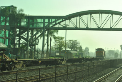 Metrolink 673X from a different angle. I walked back to the train and Robin was waiting for me at the ramp. By the time we got back, the train was now open and we took seats in the bicycle car of this special train. Twenty people boarded the train before we left on time at 9:35 AM. It is too bad that Metrolink does not run this service out of Oceanside since it forces the Ram fans from points south of Laguna Niguel to take the regular Sunday trains that fill them up. We stopped at Irvine, picking up another twenty-four fans then went to Tustin for thirty more, Santa Ana twenty, Orange twenty-two, Anaheim eighteen, Fullerton five, Buena Park seven and Norwalk three fans. The two of us detrained at Norwalk and went up onto the pedestrian bridge over the BNSF mainline.