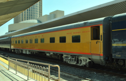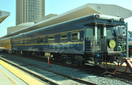 Observation Car Tioga Pass, built by Canadian National Railway in 1959. Originally number 23, and later number 93, "Tioga Pass" spent most of its life in Edmonton, Alberta where it served the Vice President of the Mountain Region. In 1992 Canadian National decided to sell the car, and a local businessman in Barstow, California named Rutherford P. "Rudy" Hayes bought it sight unseen because, as he put it, "I always just wanted one." In an epic trip, the car travelled from Edmonton to Barstow in January 1993. Through fierce cold and driving blizzards, the passengers stayed warm inside. Its new owner was like a proud father, pronouncing the car was all he ever thought it would be. Unfortunately, Rudy never got the chance to travel on his new car. He died of a heart attack only months after it was delivered. The car sat, forlorn and neglected in front of the Harvey House train station in Barstow for several years. Aronco Leasing Company and Norman Orfall purchased the car in 1997 from the Hayes estate and completely overhauled it over several years.
