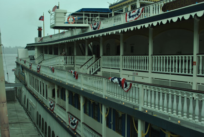 We were enjoying the views until our un-favorite Tropical Storm Cindy decided to send monsoonal rains that made everything, even under the covered decks, wet. Elizabeth and I ended up in an unused lounge and sat at a table, then talked and she discovered that I wanted a Tshirt of the Showboat experience and she offered to get me one. While she was off doing that, a gentleman was bringing in tables who told me they were having a bigger crowd tonight and they would be using this room but we were allowed to stay. All too soon, the boat was returning to the dock and we went out with umbrellas to fend off Cindy's wrath to be ready to disembark.