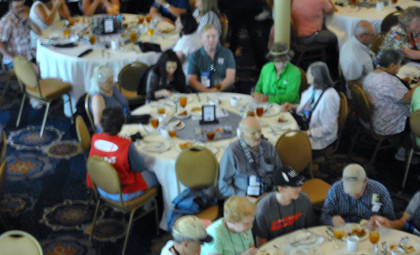 The NRHS Banquet 6/23/2017We went to the social hour where I paid four dollars for a Coca-Cola. After that stupid move of mine, I remembered there was a vending machine on the second floor so would not make that mistake again. At 7:00 PM, the doors were opened and we went into the banquet room. We were greeted by John Goodman, the convention chairman, but this year for some reason, there was no invocation at the beginning which I found very strange as we were in the Bible Belt of America. For my dinner, I had the chicken which I have to admit was not as good as the Showboat's. After the recognition and introduction of guests, the Rail Heritage Grant collection was announced and $3,168 was raised by all of us in attendance. Following that Al Weber, the NRHS President, spoke and afterwards, John Goodman then introduced Mr. Robert D. Tuke whose speech included a Powerpoint presentation on saving Nashville's Union Station from demolition, but not the trainshed, which was the largest in America. Once he finished, the banquet was over and we returned to the Days Inn where we continued working on stories.