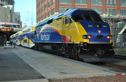 Northstar Commuter LineThe Northstar Line is a commuter rail route in the US state of Minnesota. Northstar runs 40 miles from Big Lake to downtown Minneapolis at Target Field using existing track and right-of-way owned by the BNSF Railway. Passenger service began on November 16, 2009. The rail line serves part of the Northstar Corridor between Minneapolis and St. Cloud. Planning for the line began in 1997 when the Northstar Corridor Development Authority was formed. The corridor is mostly served by Interstate 94 and U.S. Highway 10.
