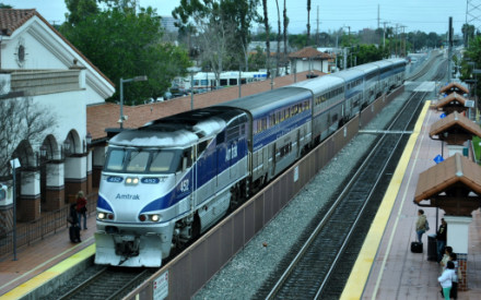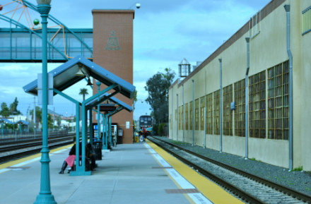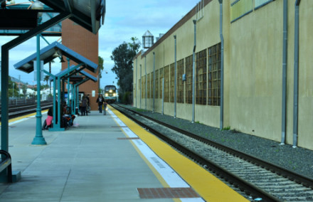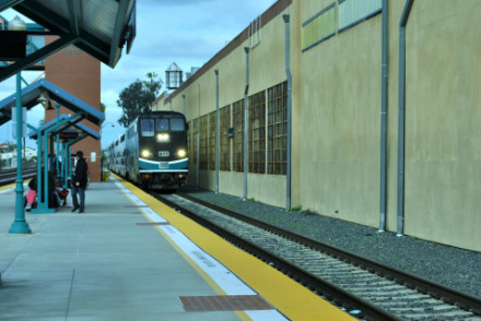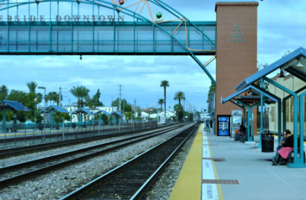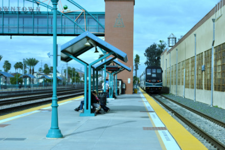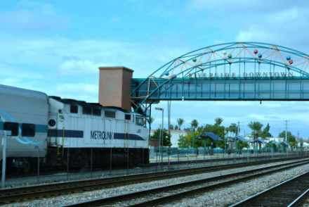 After that I drove down to the Santa Ana station, parked in the northeast parking lot then bought my Metrolink round trip ticket to Riverside. I walked up the stairs and across the bridge then took the elevator down to Track 1. A few minutes later I saw Bill and called to him to walk up the stairs and across the bridge and while he was doing that, I got on the Metrolink ticketing machine and set it up for his round trip ticket to Riverside which he paid with his credit card. The crossing gates went down and I climbed the stairs to get a better photo angle.
