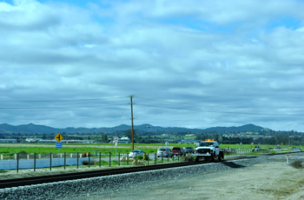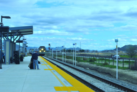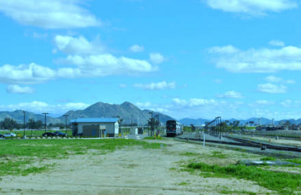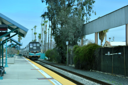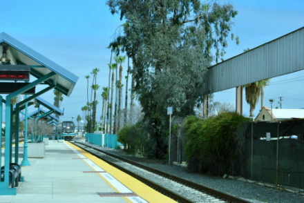 Bill waiting for his first train to South Perris to depart. We departed Riverside at noon and Bill was on new rail mileage until we returned to BNSF mainline. Once we reached the Perris Line Junction, Bill would be on new mileage all the way to South Perris. Since this is my third story about this line, I wouuld not be taking any pictures. We climbed the grade to the Hunter Park/UCR station then climbed the Box Springs grade and Bill was really impressed. Next we stopped at the Moreno Valley/March Field station and Bill enjoyed watching us pass the cars as we ran along Interstate 215. He was able to see all the industries that the BNSF serves along our route. We then stopped in Downtown Perris before we ran the rest of the way out to South Perris where we detrained.