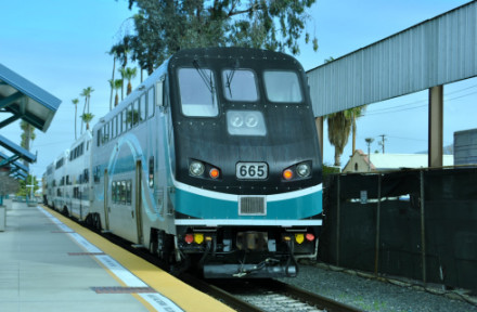 Pacific Surfliner 566 arrived before leaving for San Diego. A few minutes later Metrolink 803 came in much too fast and missed the handicapped ramp on the south end of the platform, so we had to walk fast and board the cab car then walked through it to the bicycle car, where we sat a table with me riding backwards. The train left Santa Ana to Orange and I always enjoy it when my friends start their new rail mileage. As we went up the Olive District, Bill told me that he worked in a building with a staircase outside the back door and I found the building. The train then crossed the Santa Ana River before crossing the Riverside Freeway and stopped at the Anaheim Canyon station. Once we left there it was only 0.8 miles to Atwood where Bill's new mileage would now be over since he had ridden the Barstow Flyer a few years ago over the BNSF mainline. I then learned he had never ridden the San Bernardino Line nor the Riverside Line of Metrolink. We enjoyed the lake on the BNSF maintenance road in Santa Ana Canyon before we stopped at West Corona and Downtown Corona stations. We made our way to La Sierra before arriving at the Downtown Riverside station where we detrained.