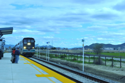 Metrolink 803 leaves Riverside for San Bernardino. We walked to the east end of the platform then heard a train horn coming our way.