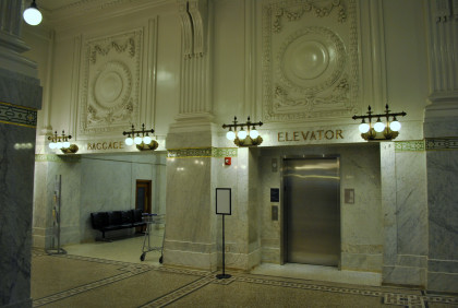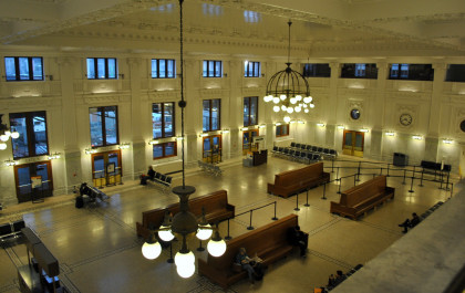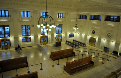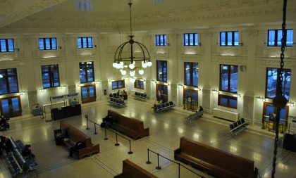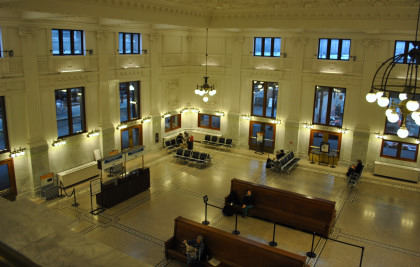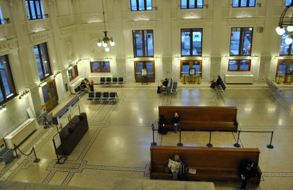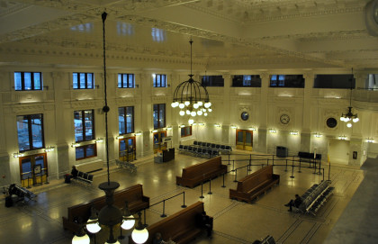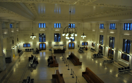 The leading end of our Sounder train at King Street. We took the elevators up and over the walkway then walked into the station. I put my baggage on a bench and Elizabeth watched them while I walked upstairs to the balcony high above the waiting room to show you the restored station.