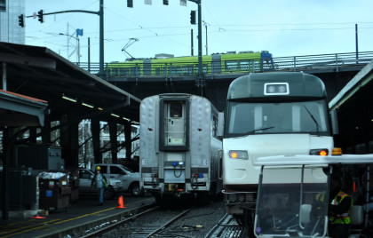 Coast Starlight train 11 at rest in Seattle. This Coast Starlight had engines 817 and 124, baggage 61507, transition 39033, Sleepers 32048, 32072 and 32016 "Pennsylvania", diner 38016, Business Class 34512, lounge 33026 and coaches 34094, 31000 and 34038. Our AC told me to board now as my door had been shut so I walked through the train back to my room 3 in the 32072. We departed Seattle at 9:39 AM (9:35 AM}, four minutes late, and was heading home.