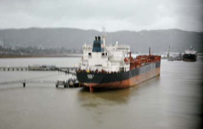 Crossing the Martinez Carquinez Strait Bridge into Martinez, our next stop. Union Pacific 2678 East passed by while we were here, after which we departed at 11:26 AM {7:34 AM}, 3 hours and 52 minutes late.