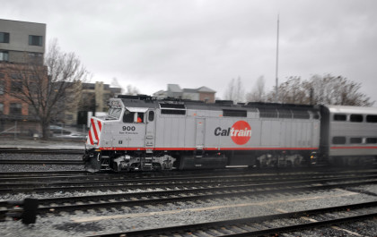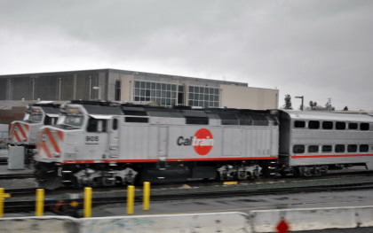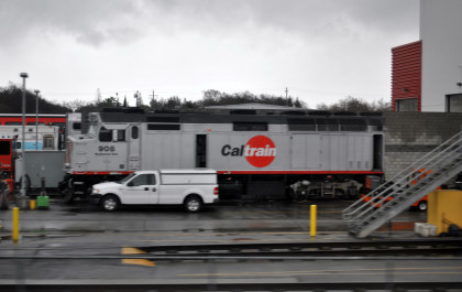 Caltrain engines at their maintenance facility in San Jose.