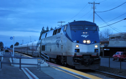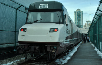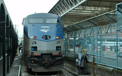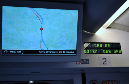 With no bathrooms in Pacific Central Station until March 17th as they are under renovation, I used the very wet inside portables out in front. As we had plenty of time before our Cascades train, we decided to have an early dinner inside the station at A&W where I had a hamburger and a mug of root beer which always makes me happy. With time to spare, I put the pictures in the computer and prepared them for this story. At 4:20 PM, we joined the Business Class line to go through preliminary United States Customs. My documents were checked and I passed with flying colors. Elizabeth had slightly more procedure to go through but nothing that had no happened in the past. Once we were cleared, we boarded Amtrak Cascades Train 517 in the gated area and were assigned seats at a table.