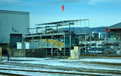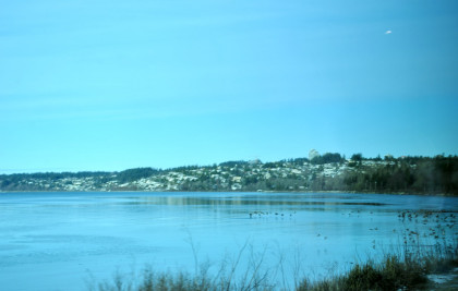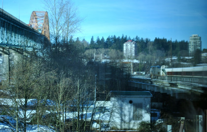 The train crossing the Fraser River. We came to a stop at Stillcreek where we became a still train. We sat for the first fifteen minutes until our conductor announced that a CN freight could not make the hill in front of us. Fifteen minutes later, he announced that the train was backing down the hill and would then split into two sections so they could double the hill after we cleared. After another fifteen minutes we started moving. Our conductor apologized for this unique delay and we then headed down the hill toward the station.