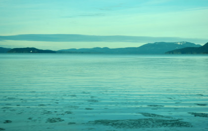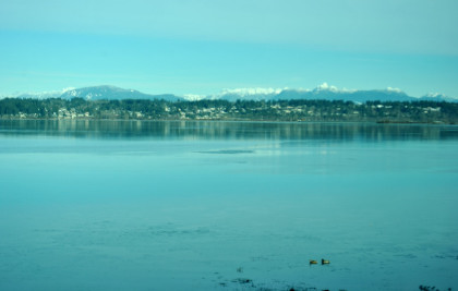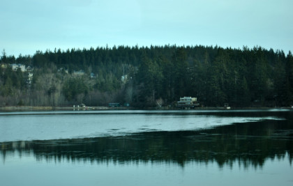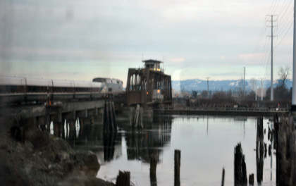 Bob Alkire had to work today so Elizabeth and I left the house after a delicious breakfast and headed to the Edmonds Amtrak station. We parked the car in the Sounder parking lot and went inside to check in with the Amtrak station agent. He looked at my passport and train ticket and Elizabeth's Nexus card and train ticket. We sat in the waiting room for just about ten minutes, watching a gentleman take down the Christmas lights on the station. With eight minutes until train time, Elizabeth and I walked out and stood where we were told to. Soon the crossing gates went down and we saw the headlight and the image of the train approaching Edmonds.