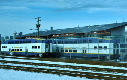 The front of our train in the cage at Pacific Central Station. We both cleared Canadian Customs without a snag walking over to the Main Street/Science World station and I bought Elizabeth and I day passes for Skytrain. We tapped our day passes to open the gate before we went upstairs to the platform. Vancouver is no longer on the honor system.
