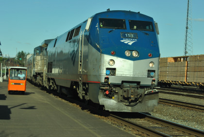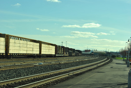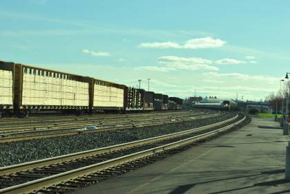 A surprise grain elevator in Oregon. I had never seen one in the Willamette Valley before and it seemed as though it was a scene out of Kansas. Was I in the Wizard of Oz? We then drove to Perryvale Road where there was supposed to be a Southern Pacific depot but in reality there is not one. Sometimes all my good planning goes to waste. We continued on over to Albany taking a very unique route where we actually went down a street called Parker. I called Chris Parker while we were on it but it went to voicemail. We took this unique route so we could cross the Willamette River, where if we would have been able to use the closed ferry, we could have reached I-5, but with the ferry being closed, we had to get back to Highway 20 to reach Albany, which led us almost straight to the Amtrak station. We were able to see a couple of trains so sometimes luck is with us.