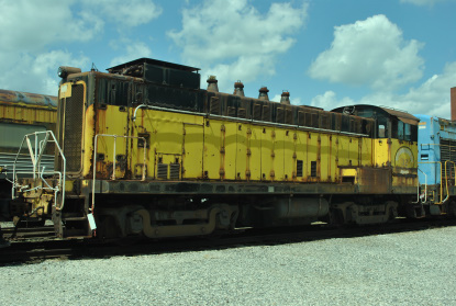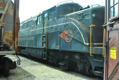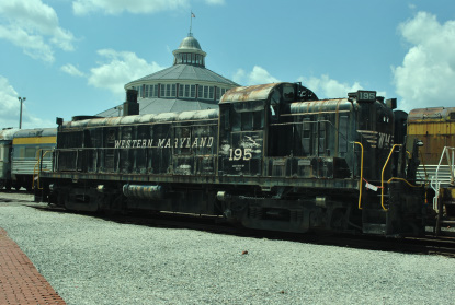 Western Maryland RS-3 195 built by American Locomotive Company in 1953 and replaced the 2-8-0 Consolidation steam locomotives on the railroad's coal drags in West Virginia and, as well as switching, hauled other freight and passenger trains. 195 retired from service in 1976 and was stored in operable condition then after cosmetic repairs in Cumberland, was donated to the Baltimore & Ohio Railroad Museum in 1976.