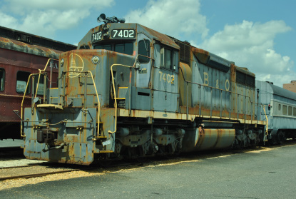 CSX SD35 4550, nee Baltimore and Ohio 7402 built by Electro-Motive Division in 1964. After its retirement, 7402 was stored at Queensgate Yard in Cincinnati, Ohio. When acquired by the museum, the locomotive was in Chessie System paint then in 1995, it was repainted to its as-delivered B&O paint scheme and returned to the number 7402.