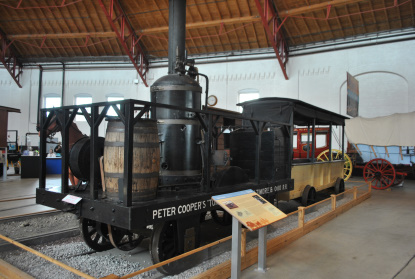 Peter Cooper Baltimore and Ohio Tom Thumb and Director Car replica built in 1927 for the Fair of the Iron Horse. The original was built in 1830 by inventor and businessman Peter Cooper as a demonstrator locomotive. On August 28, 1830, it carried the Baltimore and Ohio directors in a passenger car to Ellicott's Mills, to their amazement, travelling at the then impressive speed of 10-14 miles per hour. It was later dubbed "Tom Thumb" because of its small size and weight of less than a ton. "Tom Thumb" was the first successful American steam locomotive, although it only hauled passengers until March 1831 and never went into regular service. It was salvaged for parts in 1834.